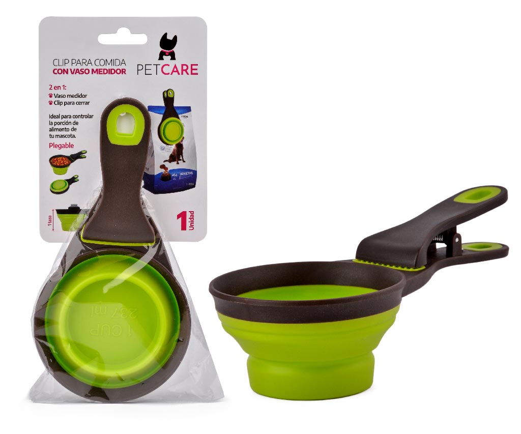 Es una herramienta 2 en 1 que combina un vaso medidor y un clip para cerrar la bolsa. Su diseño plegable lo hace portátil, fácil de usar y liviano, ideal para controlar la porción de tu mascota y mantener la comida fresca.
